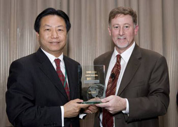写真:アメリカの雑誌《グローバルアウトソーシング》主席より賞を授与されるNeusoftグループ副総裁兼CTO方発和氏