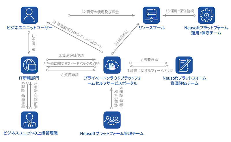 クライアントの戦略計画に基づき、Neusoftはバーチャル化、クラウドコンピューティング及び異種クラウド管理プラットフォーム技術を統合し、「必要に応じて直ちに供給」という形で、集団企業の青島本社及び中国全土に点在するサブブランチの全てのユーザー、外部のサプライヤー及び零細企業など異なる規模の実体向けにコンピューティング、メモリー資源のレンタル、データセキュリティ、システム運用・保守サービスを提供し、さらに一括課金、ポータルに関する一括管理を提供しています。